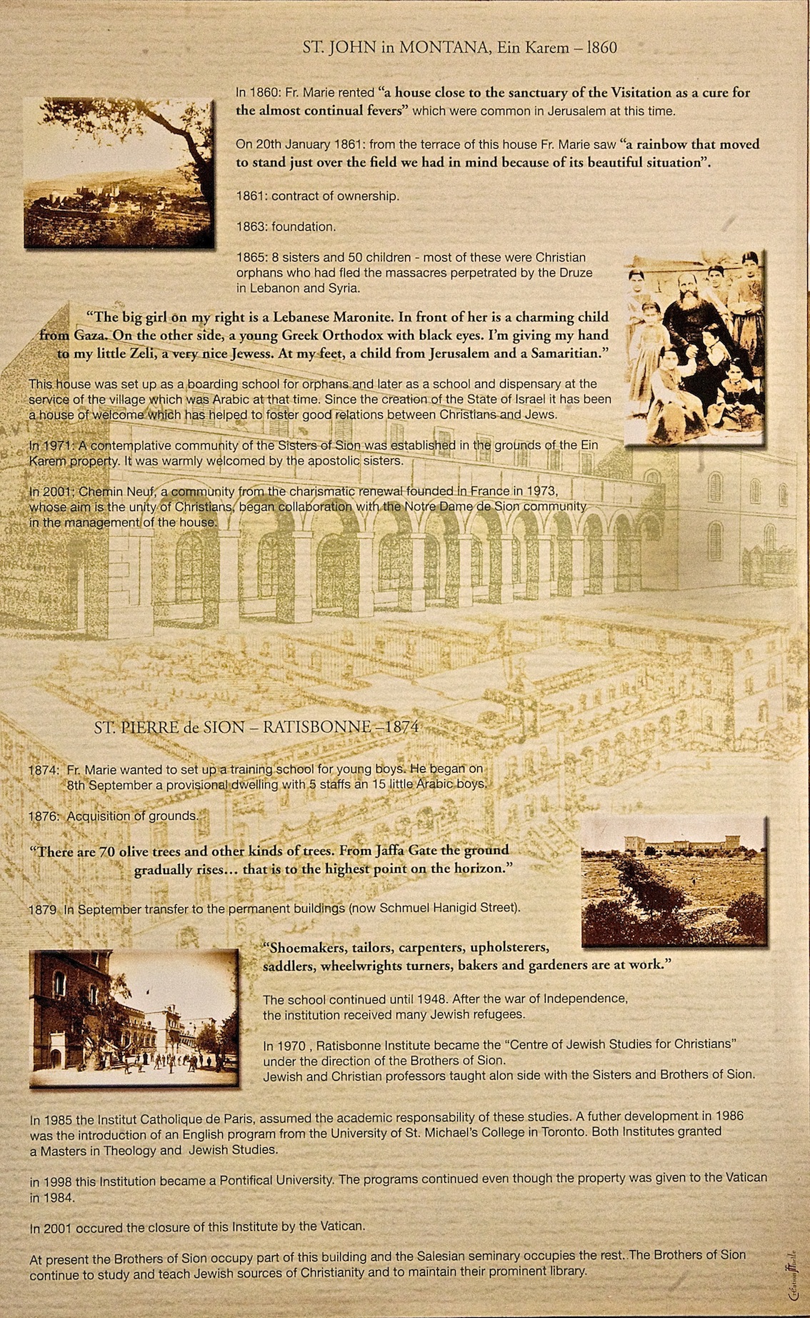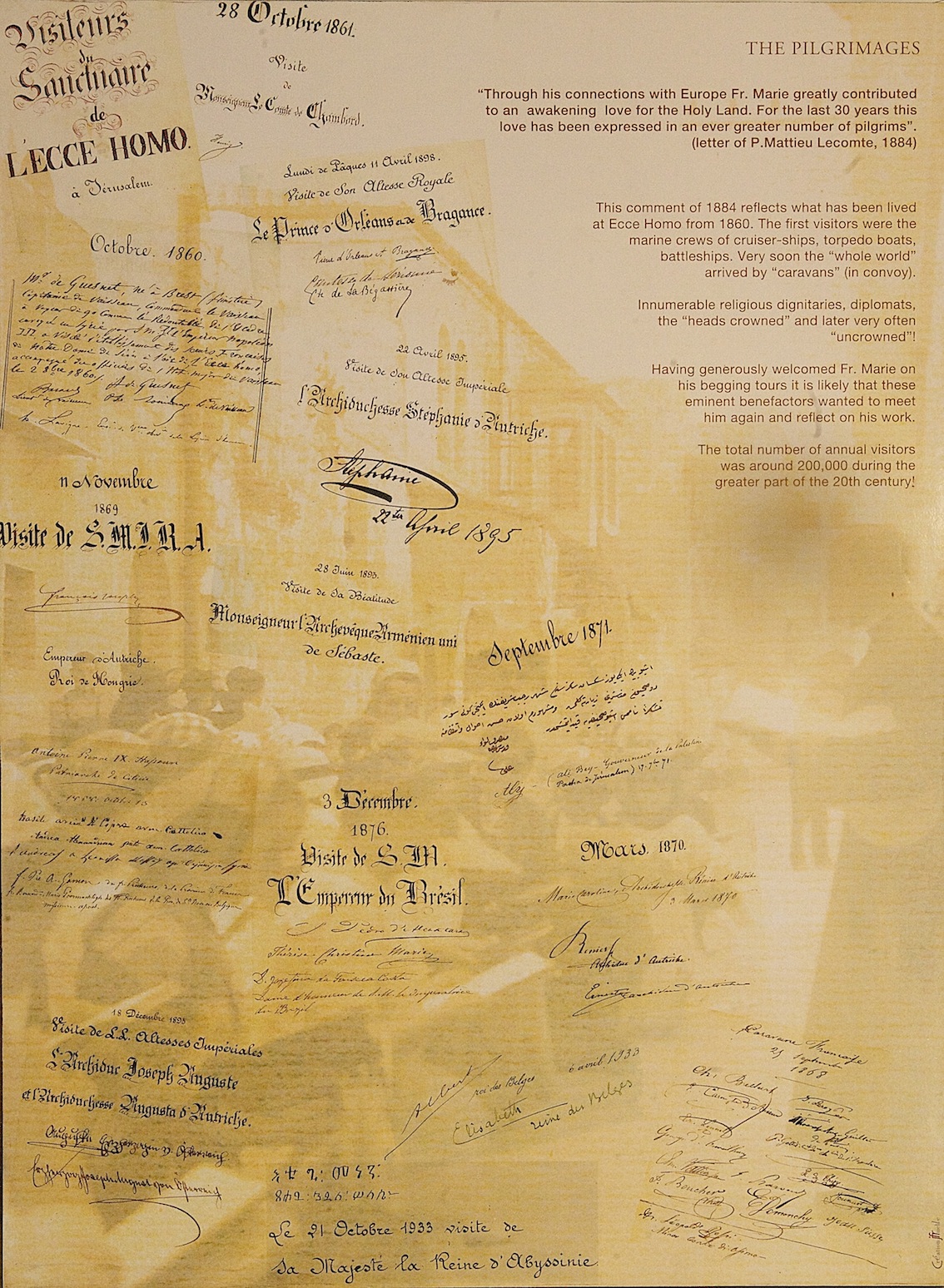 The rich and varied history of Ecce Homo can be seen in the very fabric of the building. Much is written of the remarkable Brothers Ratisbonne. Here we present a montage of history in images. We look forward to you experiencing the heritage, here at Ecce Homo in Jerusalem and Ein Kerem.
